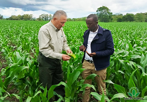 On the afternoon of November 21, Green World Group President Dr. Deming Li, Green World African Region President Mr. David L.Zhang and Professor Jason Zhang, accompanied by General Manager of Kenya Branch Mr. William Su and senior distributor leader Mr. Stephen Mbogo, visited the farm of former Kenyan President Uhuru Kenyatta in Ruiru Northland, north of Nairobi. The corn to be harvested became stronger and plumper after applying Green World Nutriplant Organic Plus Fertilizer.