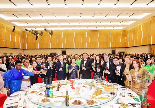 Subsequently, Prof. Deming Li, President of Green World International Group, delivered a speech, addressing the family members present, saying, "I hope everyone can share their feelings and enjoy the delicious food tonight. Let's feel the warmth of the Green World family in the joyous atmosphere." Afterwards, she and Mr. Peter Li, President of Latin American Region, Mr. Shaobo Liu, President of China Region, along with Ms. Bella Amada Cubilla Camposthe, President of the Panama Direct Selling Association, and Mr. Zhao Hua, Director of the Group's Product R&D Department, raised their glasses together, officially kicking off the gala dinner!