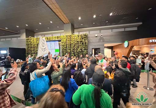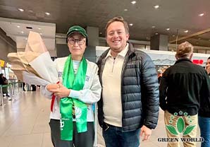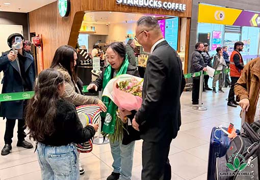 With great joy and anticipation, the local distributors gathered at the airport early in the morning on the day of the flight's arrival. Holding the welcoming banners made by themselves, they had prepared bouquets, hats, scarves and other gifts, and were excitedly waiting for the leaders' arrival. When Prof. Deming Li, Mr. Peter Li, Ms. Ying Liang and the special guests stepped out of the airport, the scene instantly burst into enthusiastic applause and cheers. The distributors rushed forward to present bouquets and gifts, extending sincere greetings and respect to the leaders and guests who had come from afar. Everyone posed to take group photos together, making the atmosphere full of warmth and passion, demonstrating the great cohesion and deep friendship of the Green World big family.