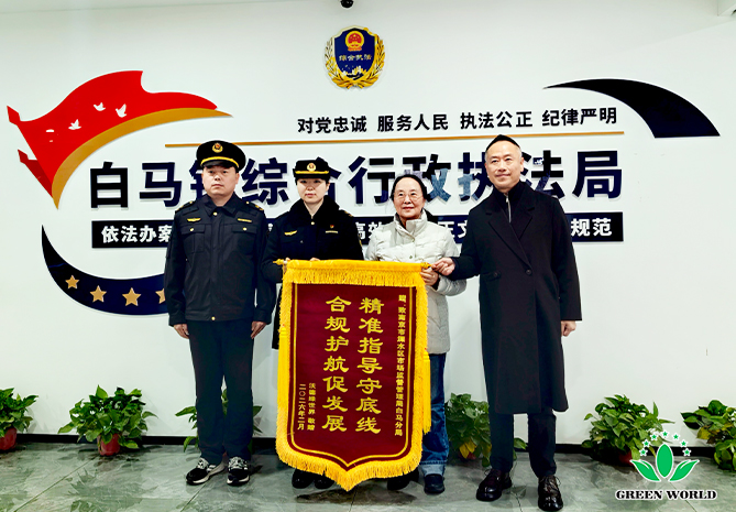 At the beginning of the Lunar New Year, Prof. Deming Li, President of Green World International Group; Mr. Shaobo Liu, Director of the Board and President of Green World China Region; and Ms. Qiaoying Liu, Executive Deputy General Manager of Green World Nanjing Production Base, visited the Nanjing National Agricultural Hi-Tech Zone and the Baima branch of Lishui District Administration for Market Regulation. During the visits, the delegation presented silk banners and letters of appreciation, extending heartfelt thanks and New Year greetings.