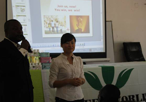 At the early stage of the conference, the branch has done enough work of promotion, propaganda and preparation. The conference formally started at noon of that day. Firstly, Ms. Wendy Hao, the general manager of Congo-Brazzaville Branch, introduced 5,000 years health promotion culture and health care concept of China in detail for everyone and then she introduced Green World Group: Green World has its own R&D base, plantation base, production base, production workshop and laboratory with advanced equipments; through many years¡¯ research, development and test, the quality and effects of the company products have been guaranteed, meanwhile, she also showed and explained every kind of products, including nutrition & health products, cosmetics, daily necessities and health care instruments, etc, the broad marketing network of Green World, preferential business plan and the specialized and professional management & marketing team.